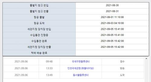 8/24일 협력사 구입 -> 27일 핵직구 도착 -> 30일 발송 ->9.7일 도착예정. 총 14일 (2주걸림)
