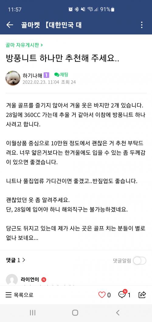 저두 방풍 니트 관심있어서 댓글들 유심히 보는중인데... 골마에 붙여넣기라니..무슨생각이신지 너무 황당하면서도 웃기기도 하네요..댓글확인하러 골마도 가봐야되나... | ||