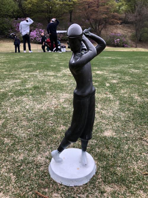 티마커가 독특합니다. 골퍼 모양입니다. 그런데 공을 쳤으면 왼쪽을 보고 있어야 할 것 같은데 아직도 바닥을 보고 있습니다.