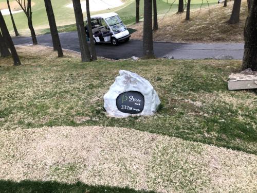 전반 마지막 홀입니다. 티샷이 슬라이스가 나서 오른쪽 나무 방향으로 갑니다. 페널티 구역이긴 하지만 가서 치면 되겠지 하고 갔더니 옆 홀과의 사이에 크리크가 있네요. 특설티로 와서 친 공이 또 슬라이스가 납니다. 4온 2펏으로 더블.