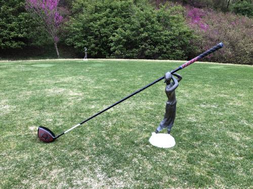 티마커에 클럽을 얹어 놓으니 꼭 동상이 스윙을 하는 것 같습니다.
