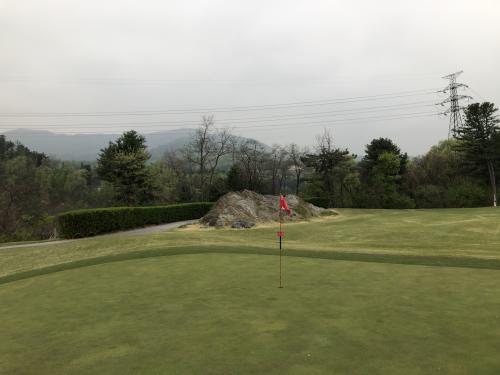 무릎 정도 높이의 법면에 공이 걸려서 2클럽 정도 길게 잡고 상체로 쳤더니 훅을 그리며 그린 주변으로 갑니다. 내리막이 아주 심한 그린 주변 언덕에 걸려있네요. 어프로치할 자신이 없어 퍼터로 굴리니 핀 옆에 섭니다. 행운의 파!