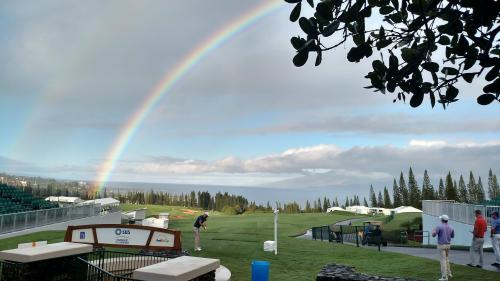 드라이빙 레인지에서 연습하는 더스틴 존슨(DJ) 머리 위의 무지개가 참 아름답습니다.