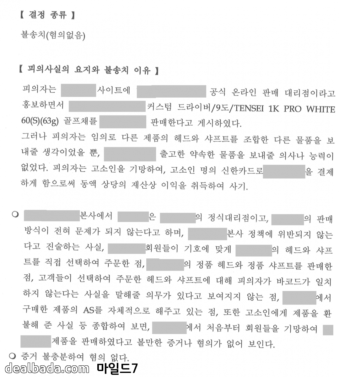 하지만, 불송치이유서를 살펴보니, 1) 본사에서 말을 번복하여 해당 판매점의 행위가 본사 정책에 위반되지 않는다고 진술하였다는 점에 황당할 따름이고, 2) 판매업체가 헤드와 샤프트의 바코드가 일치하지 않는다는 사실을 구매자에게 말해줄 의무가 없다고 판단한 부분, 3) 본사AS는 불가하나 판매업체의 자체AS가 가능하다는 부분을 수사기관이 불송치이유의 근거로 삼은 것에 대해 골프용품 구매자의 입장에서 현실과 괴리가 있는 안타까운 판단이라고 생각이 들었습니다.