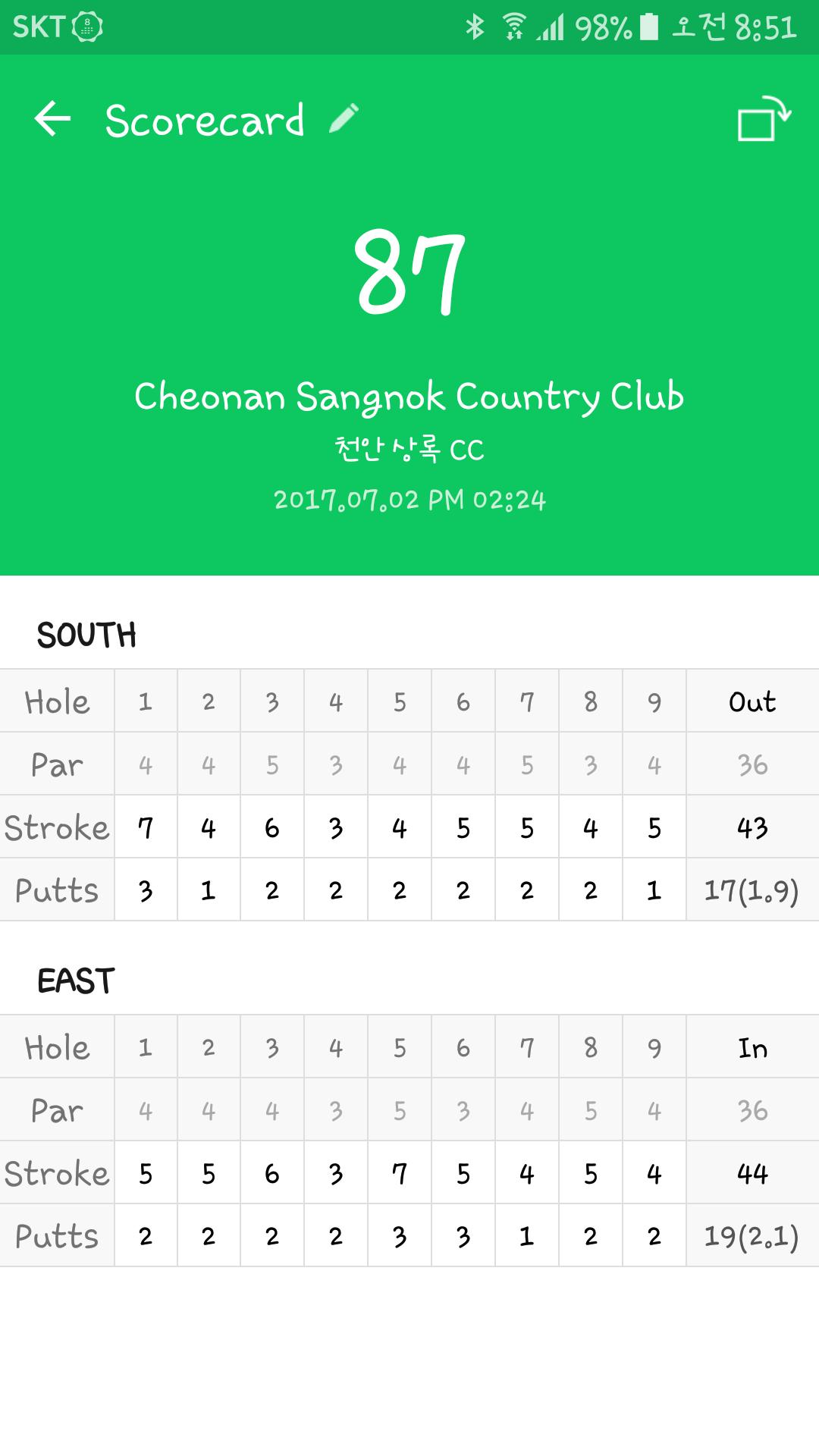 후반 3홀쯤에 비 내렸는데 다행이 쏟아지지는 않아서 크게 지장은 없었어요~~ |