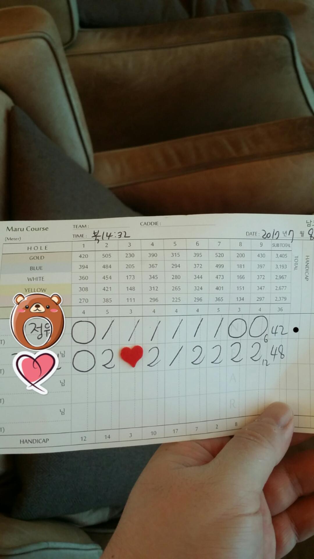 퍼팅까지 잘되었으면 진짜 5타 더 줄이는데.....쓰리퍼트 몇개있는데도 저정도 스코어라서 좀 아쉬었습니다....진짜 될듯될듯해서 ㅎㅎ |