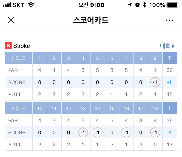 백티라도 그리길지 않은코스라 부담은 되지않았는데 요즘은 스크린 자주 치지않으니 퍼팅이 말을 듣지 않네요. 그래도 약빠라 언더는 나오는군요.