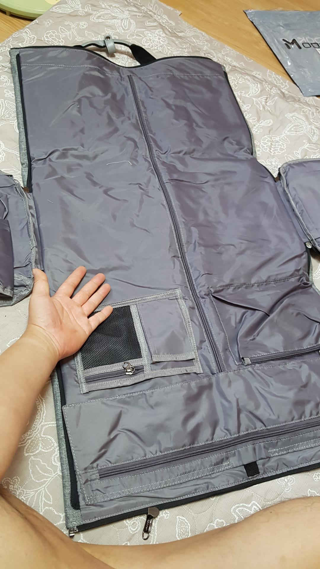 포장을 열고 내부를 보면 이렇게 구성이 됩니다. 구겨지지 않게 양복을 넣을수 있는 친절한 배려...많은 수납 지퍼가 보입니다.