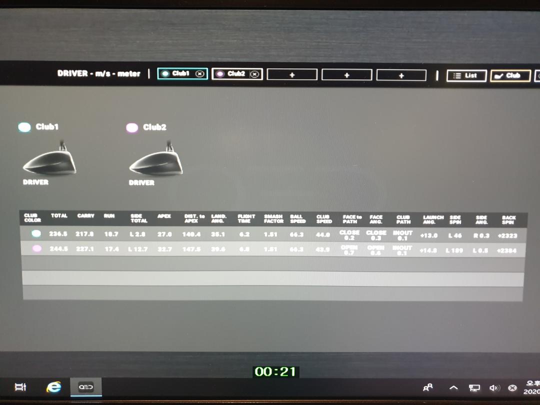 16개 데이터의 평균은 이렇습니다. 하늘색 Club 1은 RMX220 이고, 핑크색 Club 2는 G400max 입니다.