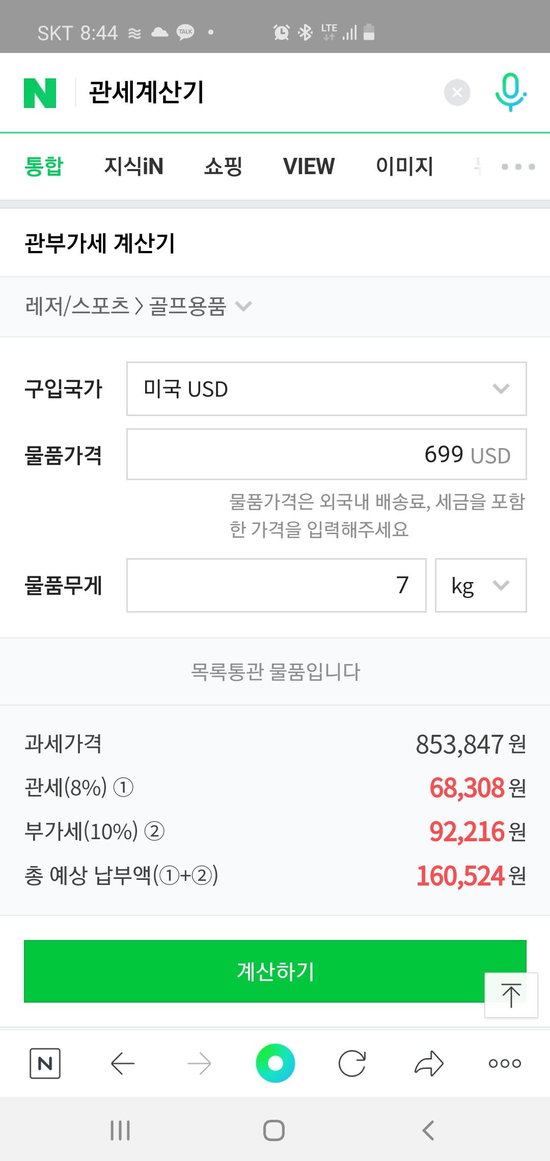 (구입금액 +구입금액의8%(관세))의 10%부가세이니.. 계산하면 90만원쯤 되겠네요~ |
