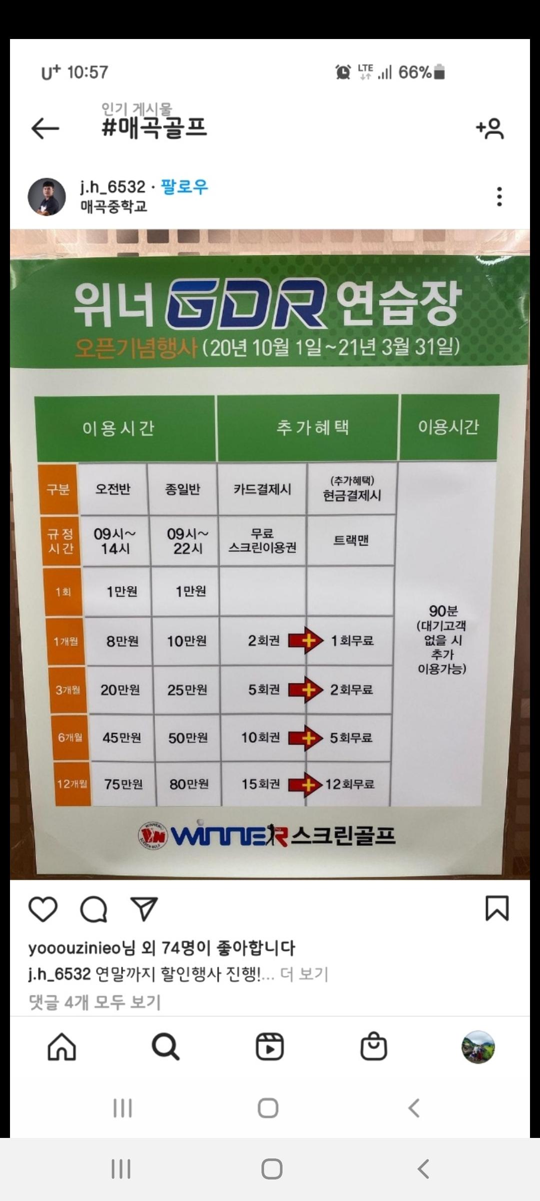 저는 고양 화정인데 타석은 되게 많은 것 같은데 1년에 12회 레슨하고 130만원이네요. ㅜㅡㅜ |