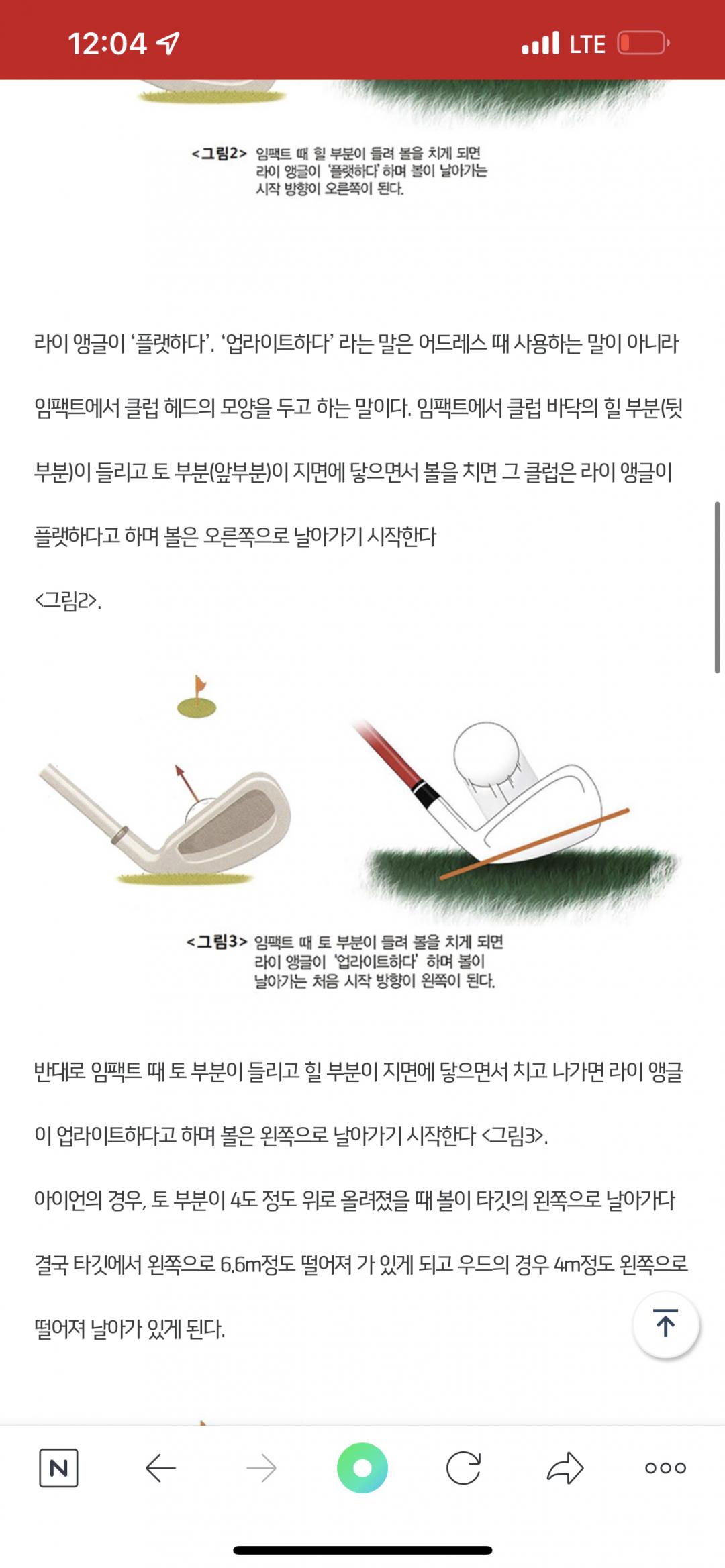 TMI하나만 추가드리자면 동적 라이각 혹은 다이나믹 라이dynamic lie각 이라는 피팅개념이 따로 있습니다. 정적 라이각은 위에 말씀드린대로 정해진 측정자세에 클럽을 놓았을 때의 라이각인대요, 동적 라이각은 1)임팩트시 손 위치 변화와 2)샤프트의 휘어짐(drooping) 때문에 클럽헤드 바닥이 놓이는 각도가 변하는 상황을 측정하는 개념입니다. 이건 사진 혹은 눈으로 보는 게 아니라 바닥sole에 스티커나 잉크 표시 후 실제로 쳐보면서 토 힐에 균등하게 바닥 접촉이 일어나는지를 비교해보는 방식입니다.