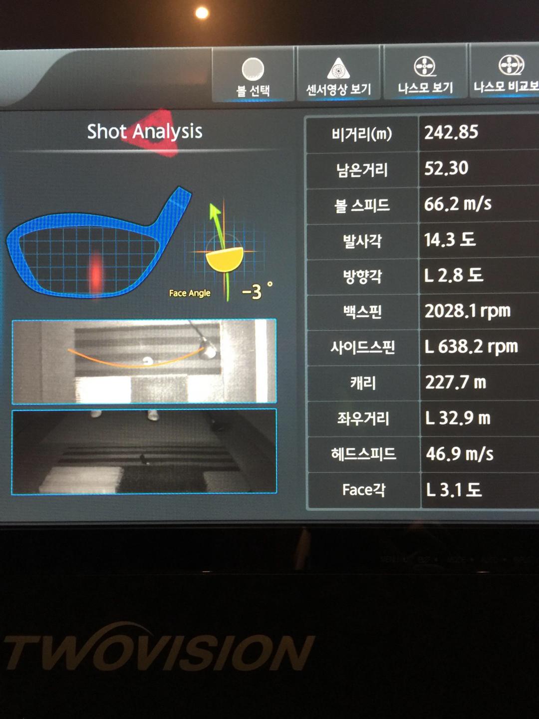 보시다시피 M-tracer의 비거리는 전혀 신뢰할 수 없습니다.. M-tracer에서 측정되는 방향각이나 페이스각이 비거리 산정에 영향을 미칠 줄 알았는데, 이 데이터들은 철저리 무시된 채 오직 헤드스피드로만 측정이 되는 것 같습니다. TwoVision에서 미스샷일 때도 M-Tracer는 무시무시한 비거리를 보여줍니다.. 비거리 정보를 확인하기 위한 용도라면, 어느 정도 오차를 감안하고 사용하려고 해도 전혀 사용할 수 없는 기계라는 결론입니다.