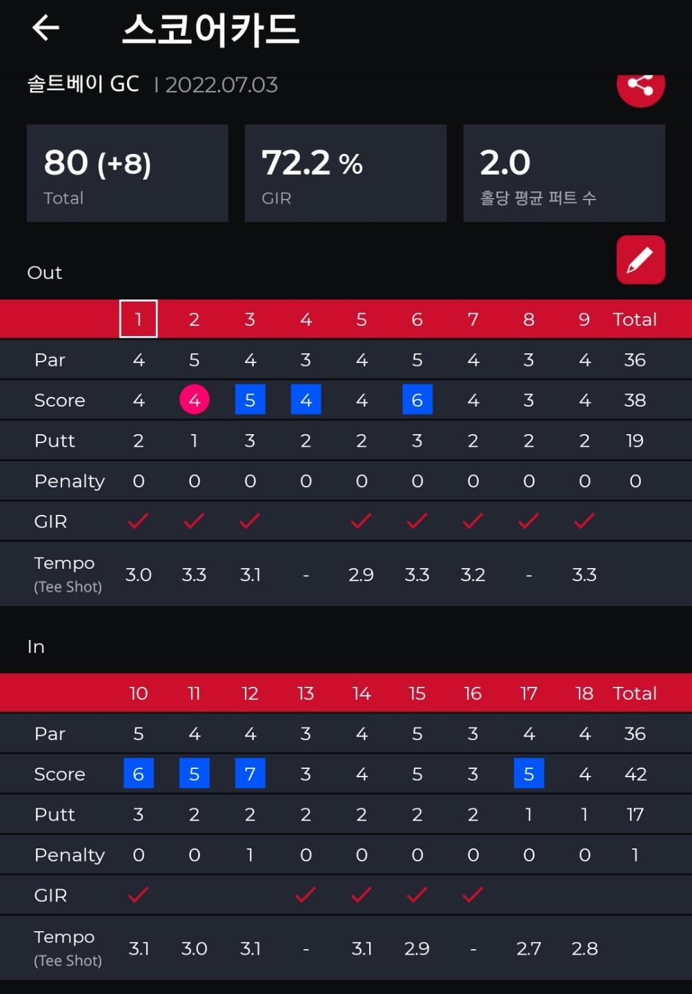 전반 6개, 후반은 2개 오버로 마무리하면서 80타를 기록했네요 ㅎㅎ 5미터 안쪽 버디펏 5개정도 놓친게 너무 아쉬운 순간입니다.