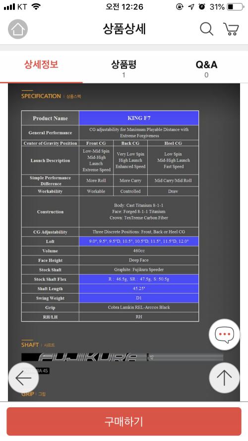 그리고 첨부된 샤프트 스펙을 보면 후지쿠라스피더45샤프트 인것 같은데 S flex가 50.5g인데요 이거 왠만한 R등급 보다 가벼운것 같은데 이 샤프트는 어떤지 아신다면 조언 부탁 드립니다. 제가 힘있는 장타자는 절대 아니지만 너무 가벼운건 아닌가 싶어서요..