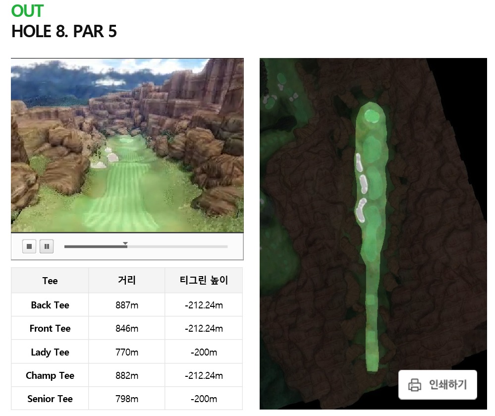 특히 8번홀 파5 한번 보십시오. 882m미터에 내리막 212m이고.....절벽 사이라 OB가 없을 것 같지만 OB,헤저드 다 있습니다.