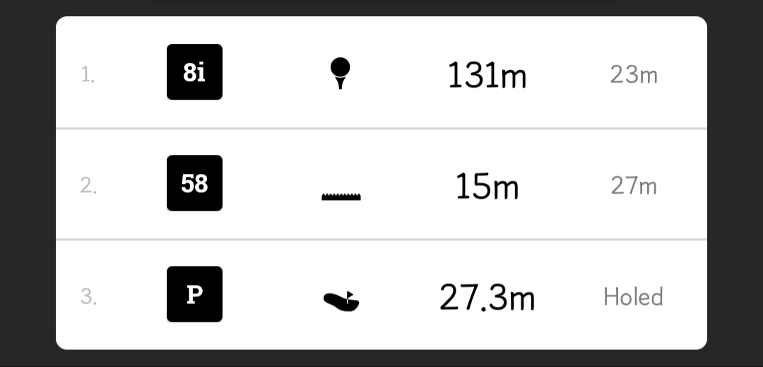 사진 보시면 131미터 거리에서 8번 아이언으로 쳐서 23미터 거리에 떨어져 온그린에 실패했고, 58도로 15미터 어프로치 시도해 27미터 거리에 붙였고(?), 27.3미터 거리 퍼팅을 성공(!)했단 기록으로 보이는데 제 해석이 맞나요?