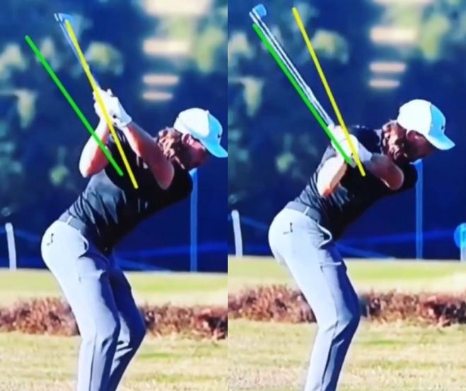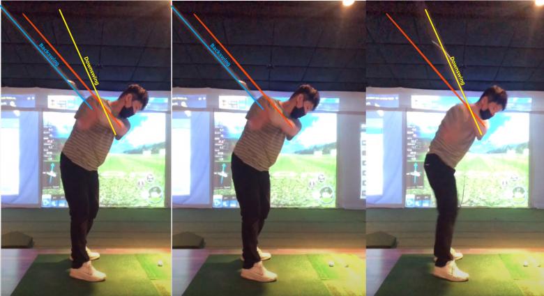 그런데 집에 와서 동영상 분석하면서 백스윙 탑 선을 그어보면 여전히 덮어치고 있는 모습을 볼 수 있는데요.