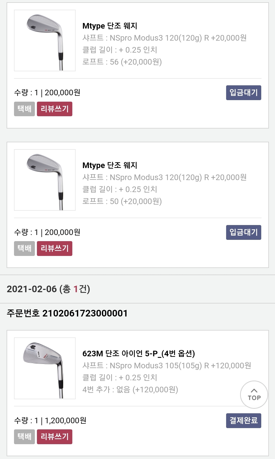 웨지도 생각보다 좋고 이뻐서 웨지까지 질렀습니다. 다만, 다골105로 맞추려고 했으나 피터님이 모두스가 더 적합하다고 하셔서 모두스 105로 주문했습니다.