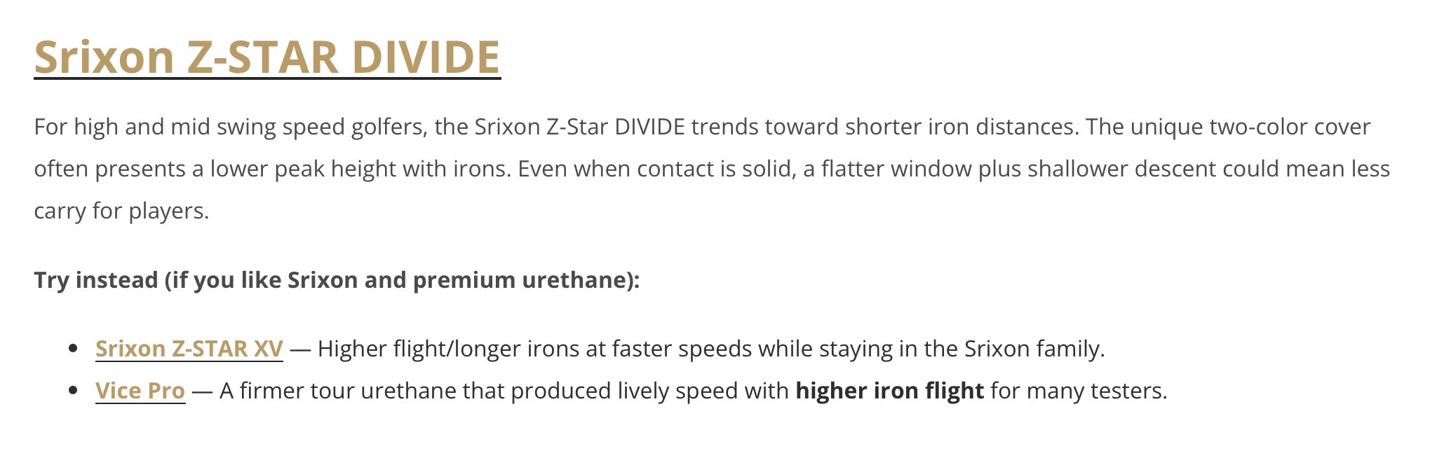 높은 스윙 스피드와 중간 스윙 스피드를 가진 골퍼들에게 스릭슨 Z-Star DIVIDE는 아이언 비거리가 더 짧아지는 경향을 보입니다. 독특한 투톤 컬러의 커버는 아이언 샷에서 종종 더 낮은 최고점(peak height)을 나타냅니다. 정타가 났을 때에도, 더 평탄한 발사각(a flatter window)과 더 얕은 하강 각도(shallower descent)는 플레이어에게 캐리 거리가 줄어들 수 있음을 의미합니다.