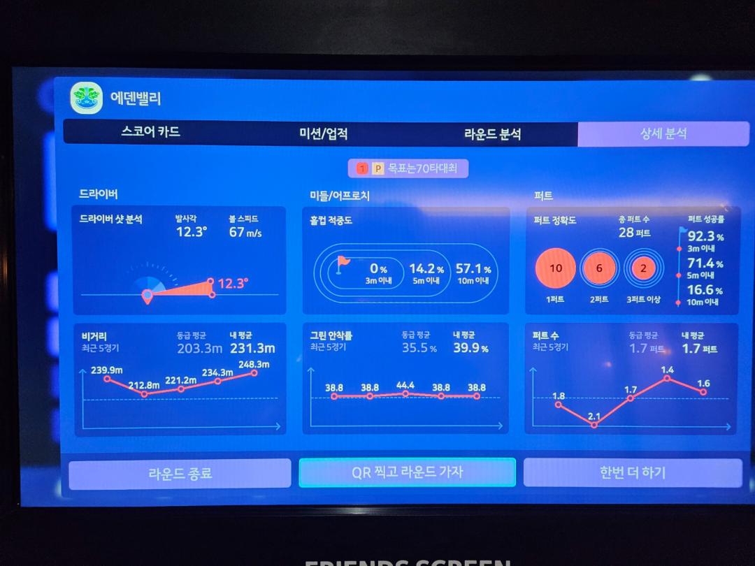 스크린에서 세미프로 난이도로 두고 연습하다 77타를 첫 달성하고 사장님에게 말했더니 세미프로는 아무 의미가 없다고 이제 프로로 두고 연습하셔보고 그래도 70타대가 나오면 인정해드린다길래 그 이후부터 프로로 난이도를 두고 컨시드 1.5에 코스,그린 난이도는 별 4개 이상짜리 들로만 연습을 해보니 이제는 프로에서도 74타와 73타를 기록하고 평균 80타 초반은 나오게 됐습니다.