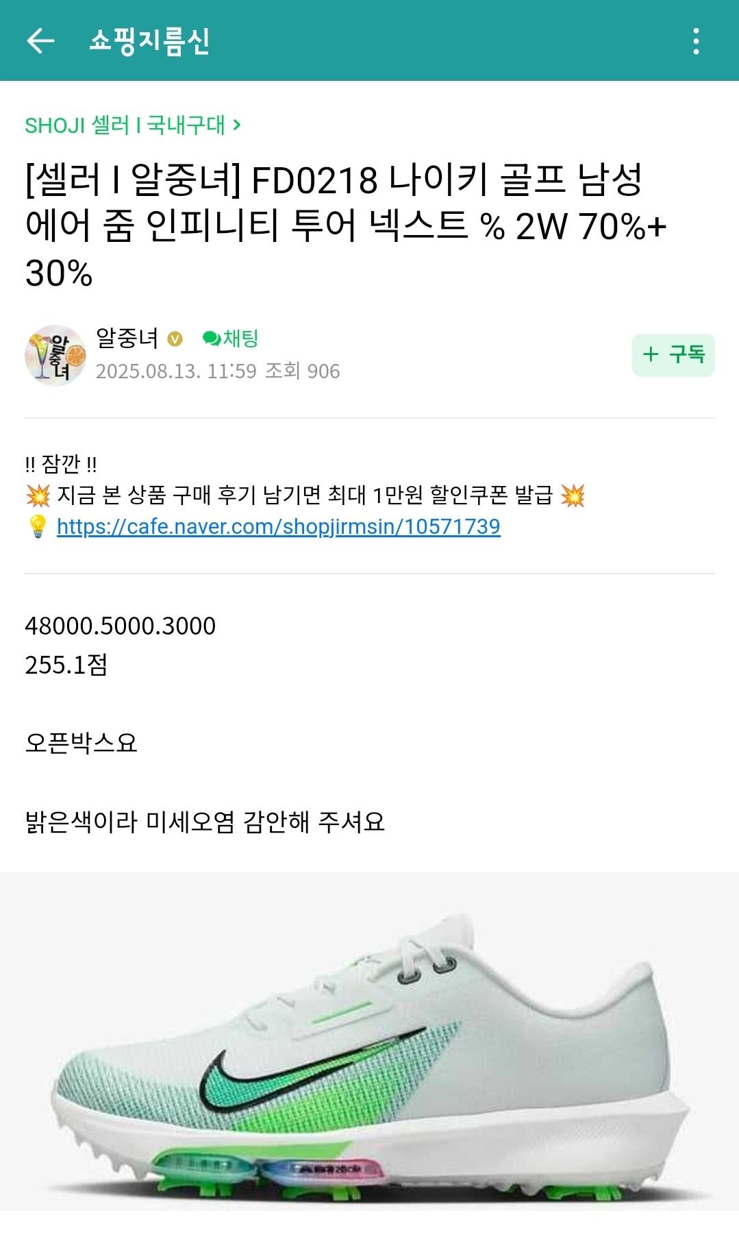 저는 최근에 아래 제품 여성용인데 사이즈 맞는것이 있어서 인터넷 최저가 보다 거의 절반 가격에 샀습니다. 남성 골프화도 종종올라오구요~