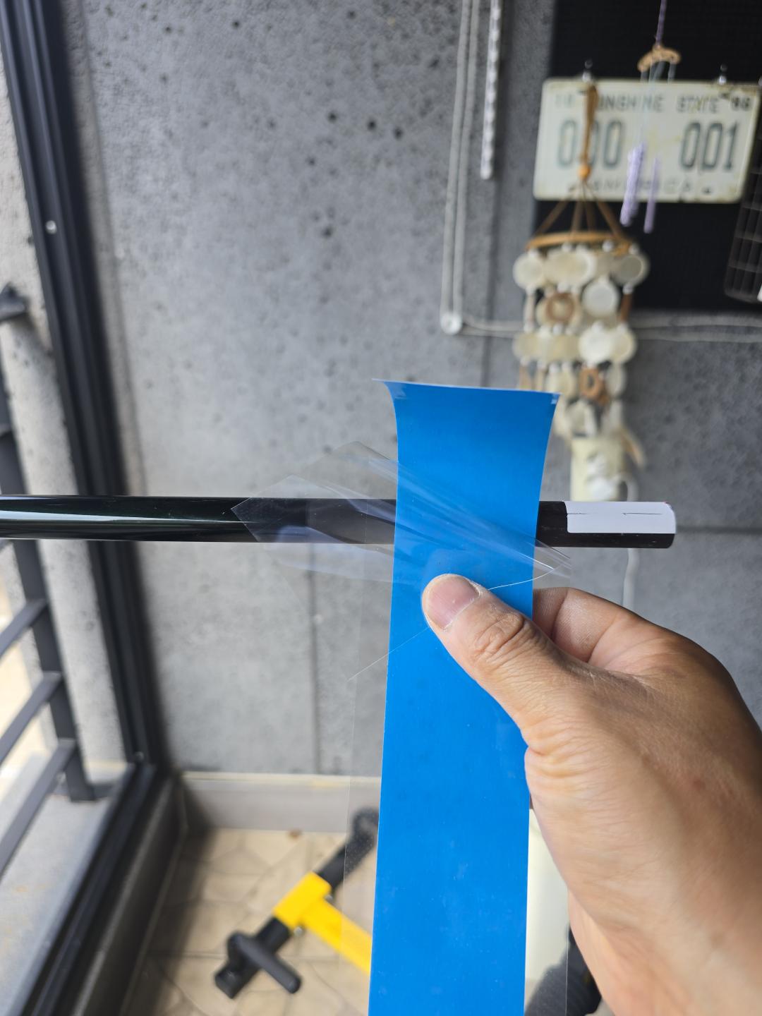 버트 쪽으로 1cm 정도 튀어 나오게 샤프트에 붙입니다. 투명이형지를 뗀 면은 기존과 같은 끈끈한 테이프 재질입니다. 반대쪽 이형지를 떼어보니 끈끈하지 않았습니다. 물을 뿌려보니 약간 끈적이기는 한데 묻어나는 것도 없고 미끌미끌한 정도였습니다. 1cm 튀어 나온 테이프는 샤프트 안쪽으로 말아 넣었습니다.
