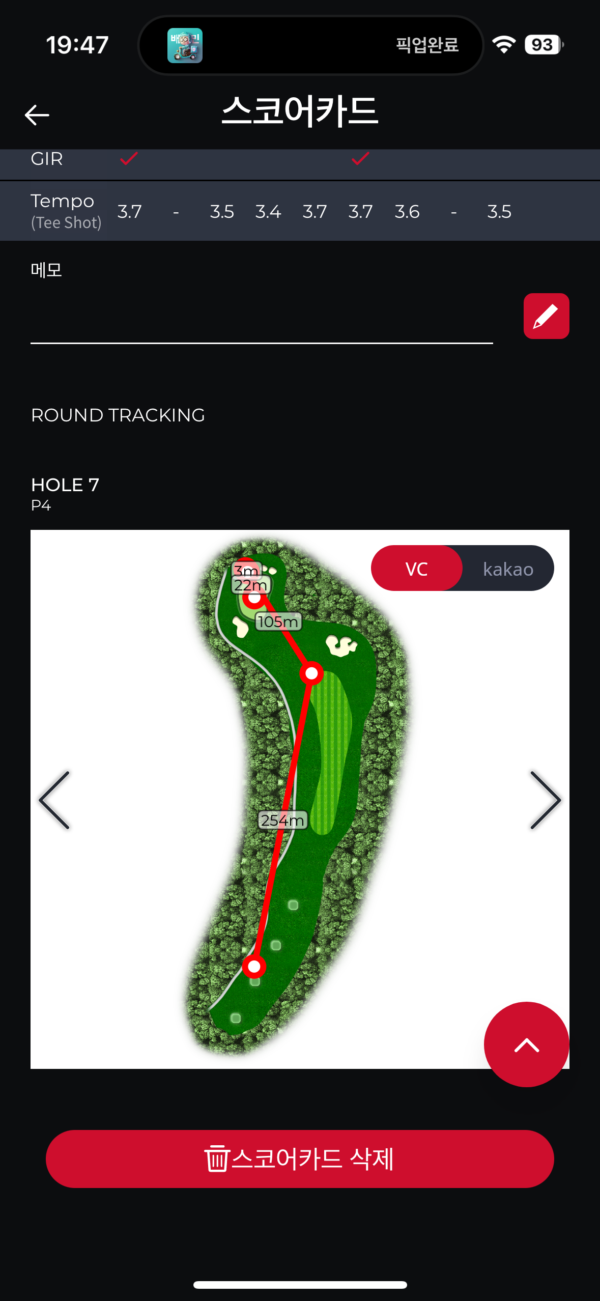 코스에서 티샷하고 세컨 지점 갔을때. 보이스캐디에 비거리 290으로 찍히고 홀까지 남은거리 90미터였습니다. 골프장 홈피에도 380미터 코스라서 290이 맞는거 같은데 라운딩 끝난후에 기록된 데이터를 보니깐 254가 기록되어있네요