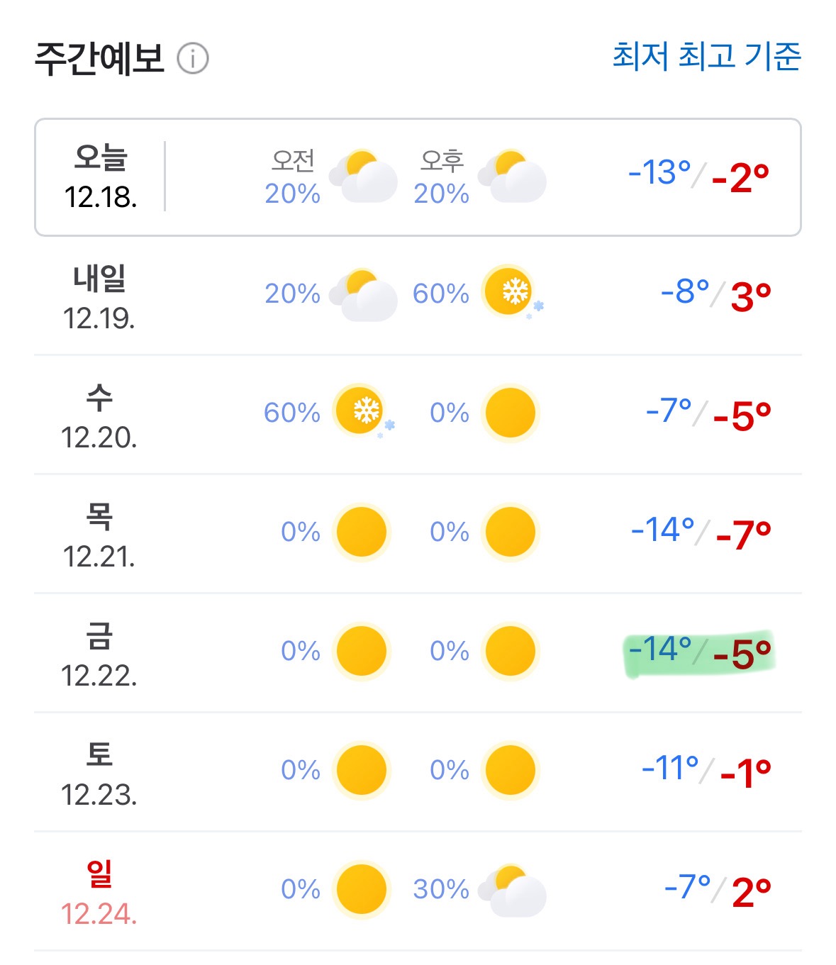 에이.. 수요일은 영하 7도밖에 안되네요 ㅎㅎㅎ