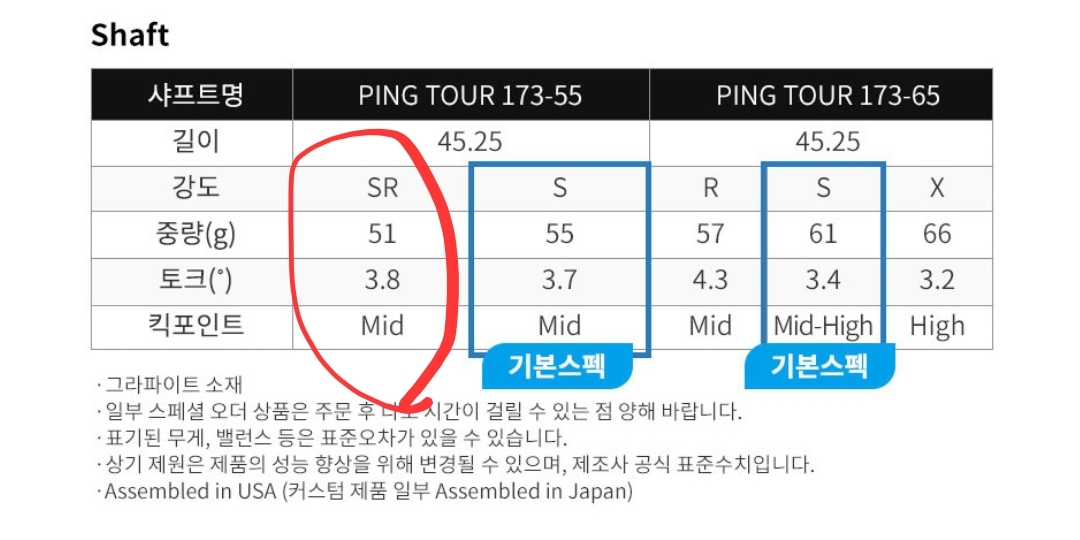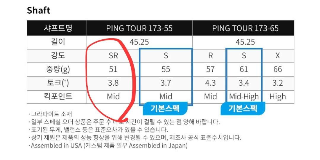 tour 173-55 sr샤프트 스펙을 보면 위와 같은데요.