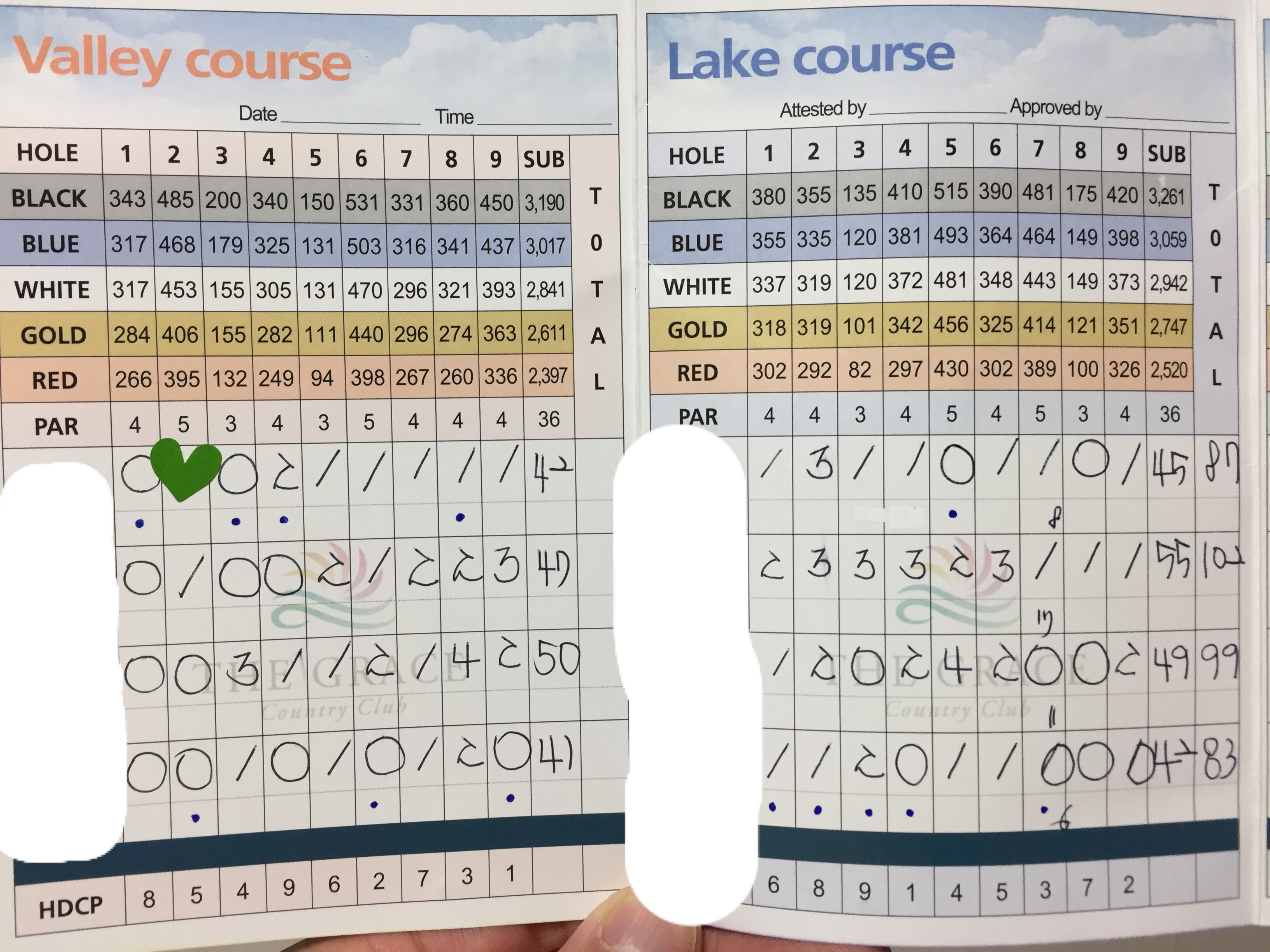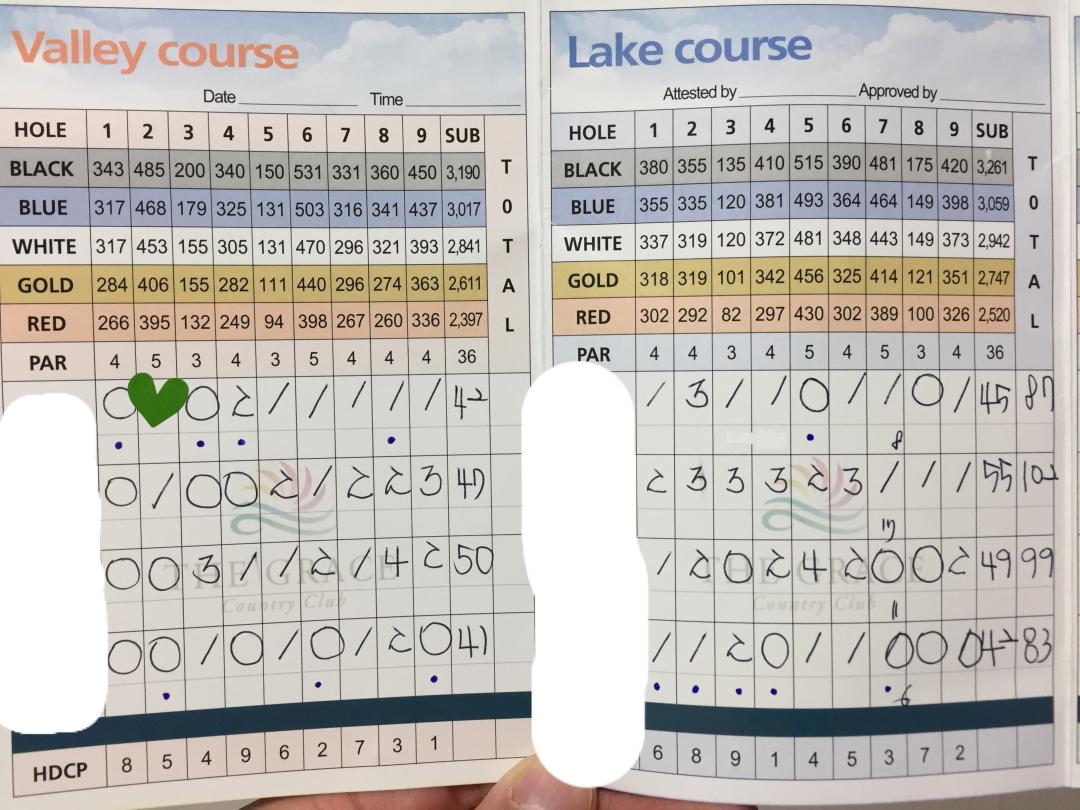 네번 ~ 여섯번은 베트남에서 블루티로 쳐서 102 ~ 117... 블루티라서 그러려니하고, 그 이후로 대여섯번 90대 초중반 스코어라 깨백의 기쁨을 몰랐습니다.