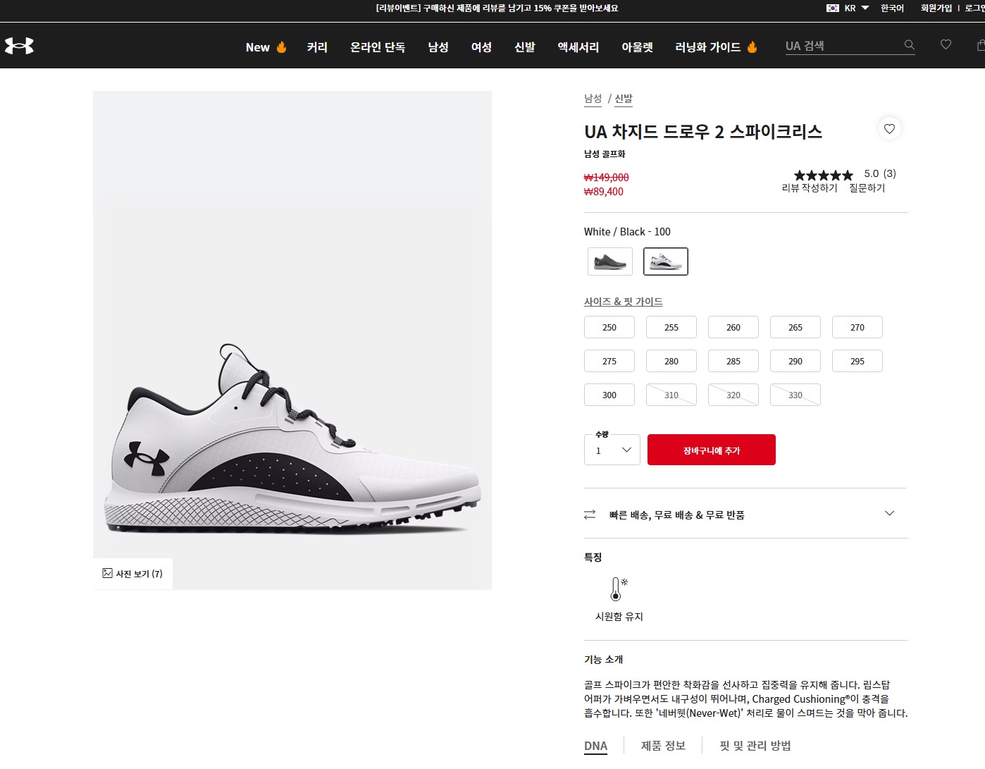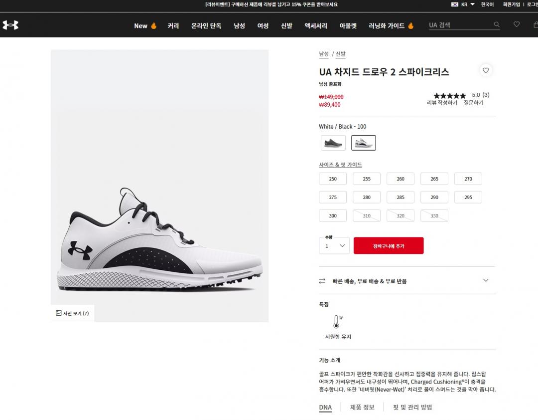 언더아머 첫번째꺼 신고 있는데 편안합니다. 매트 티샷이 많은 구장 갈 때 신는데, 발볼도 넉넉하고 좋습니다. |