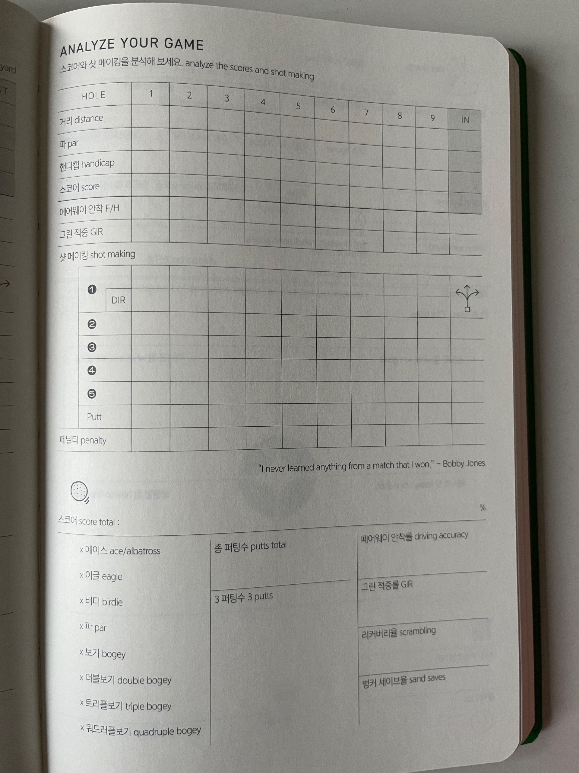 저도 받았는데 솔직히 말하면 쓸모가 없어보여요. 라운드 도중에는 절대 못들고 다닐 크기인데... 끝나고 나면 샷 하나하나 생각도 안날텐데요. | ||