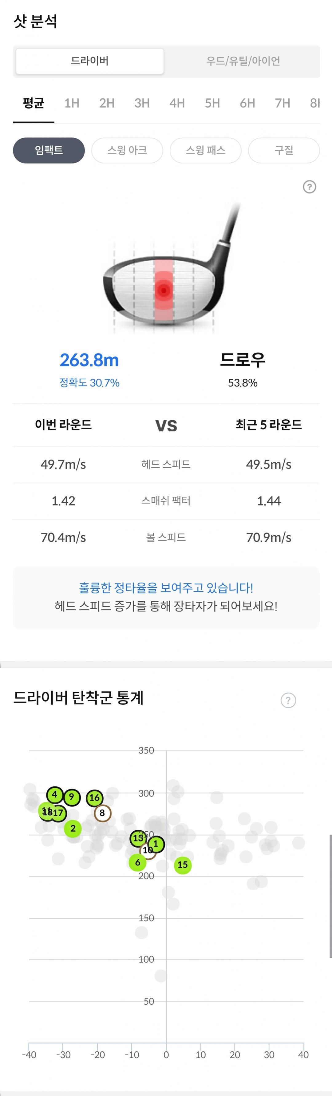 데이터는 좌탄이 많네요~ 그래프는 좌탄이 많은데 인도어 가셔서 푸쉬 슬라이스가 많다는건 그냥 그날그날 컨디션과 궤도 상태가 다르다는거거든요~