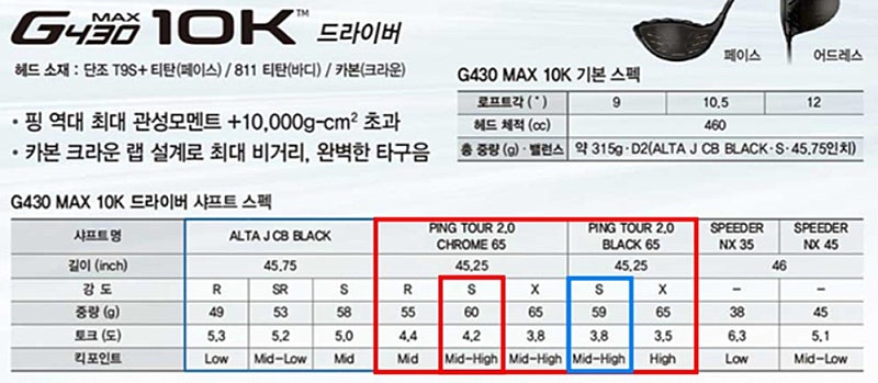제가 g425시절 55sr 잘 쓰고 55s, 65s, 65r 다 써보다가 당시 핑 스탁x로 넘어가 잘 썼었는데, 프로님 말씀의 취지대로 조금 무겁고 무른것이라면 65r이 적당하실 것 같습니다. 요즘은 핑 스탁 x가 없으니 스탁 s가 비슷할 것 같구요. 55s는 상당히 강하고, 65s는 그정도 강도에 무거워(말씀하신 토크 수치 말고, cpm이 상당히 강합니다) 당장은 버거우실 것 같습니다. |