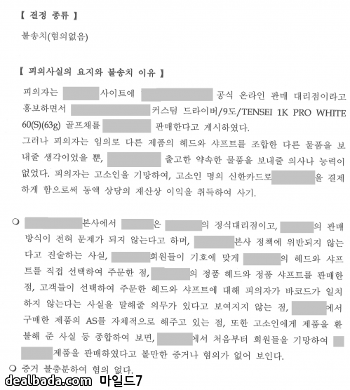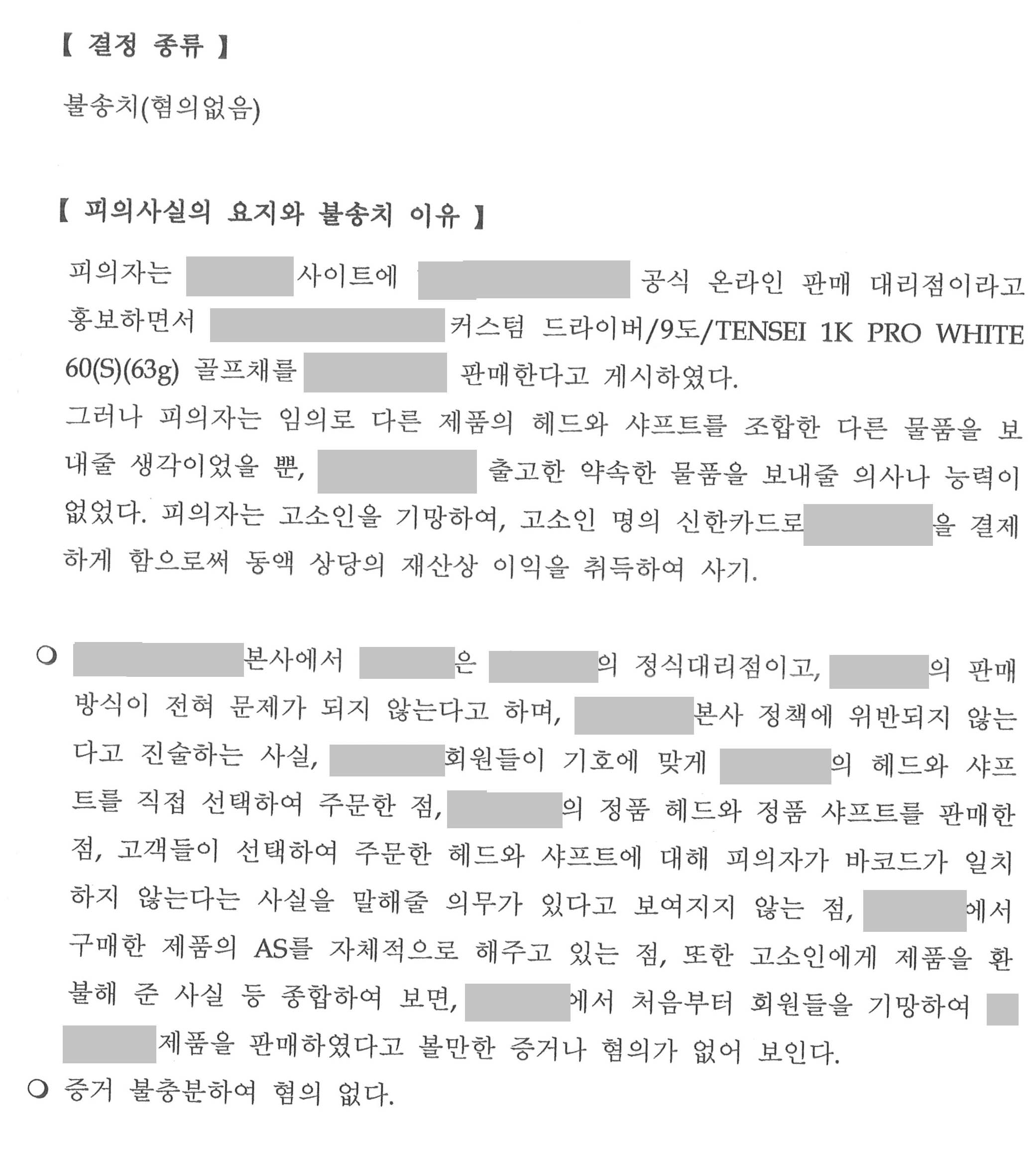 하지만, 불송치이유서를 살펴보니, 1) 본사에서 말을 번복하여 해당 판매점의 행위가 본사 정책에 위반되지 않는다고 진술하였다는 점에 황당할 따름이고, 2) 판매업체가 헤드와 샤프트의 바코드가 일치하지 않는다는 사실을 구매자에게 말해줄 의무가 없다고 판단한 부분, 3) 본사AS는 불가하나 판매업체의 자체AS가 가능하다는 부분을 수사기관이 불송치이유의 근거로 삼은 것에 대해 골프용품 구매자의 입장에서 현실과 괴리가 있는 안타까운 판단이라고 생각이 들었습니다.