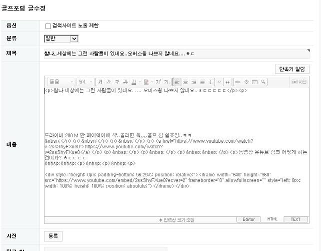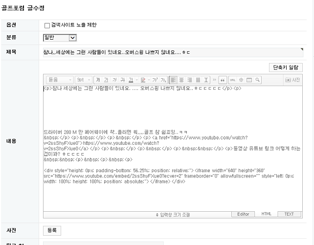 HTML 눌러서 유튜브 동영상 소스코드복사해서 붙이고.........나서.
