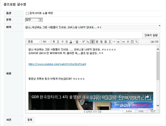 수정하기에서는 유튜브동영상 화면으로 링크는 되는데