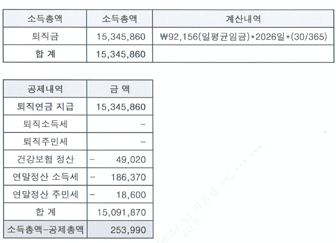 회사에 메일을 보내 전달받은 퇴직금 정산내역입니다.