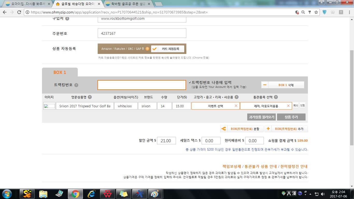 그런거 다 빼고 그냥 구매가격 189불만 적어서 제출해도 통관이 됩니다