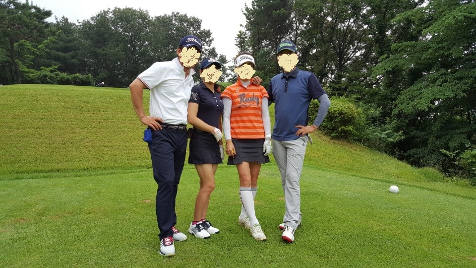 장마시즌이라 시작할땐 비가 조금씩 내렸지만, 5홀 돌고부터는 활짝 개기 시작해서...날이 개고나서 부부동반 사진 촬영...제가 젤 왼쪽에 있었습니다. 젤 오른쪽분은 드라이버 비거리가 270m ㅎㄷㄷ 얼마나 부럽던지...