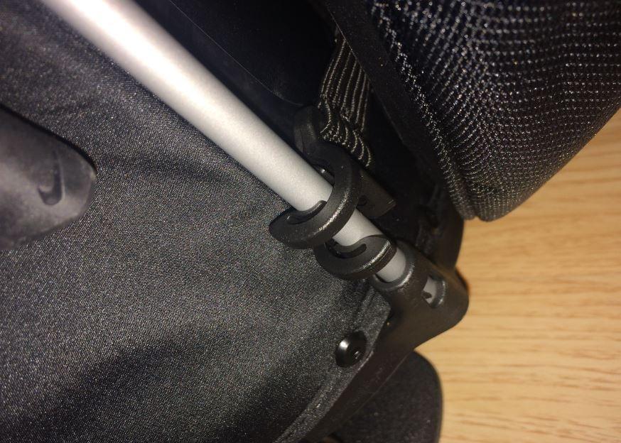 캐리어가 스탠드백이라면.. 흰색 봉에 클립형식으로 탈착이 가능합니다.