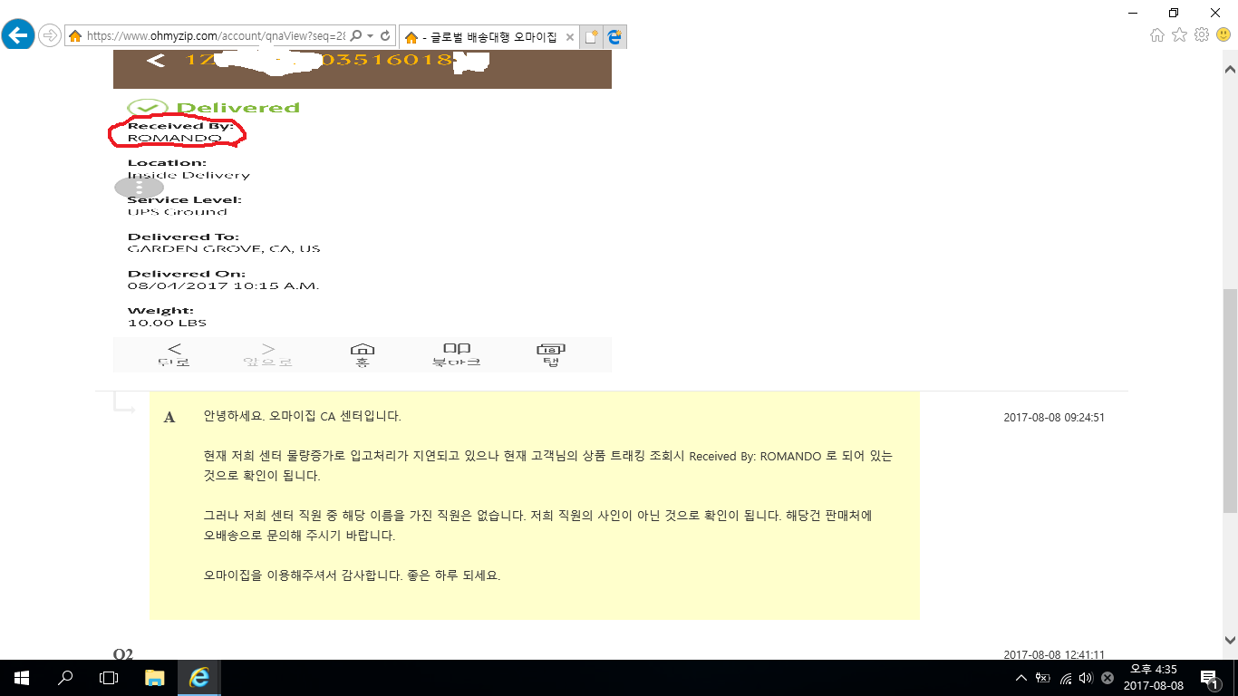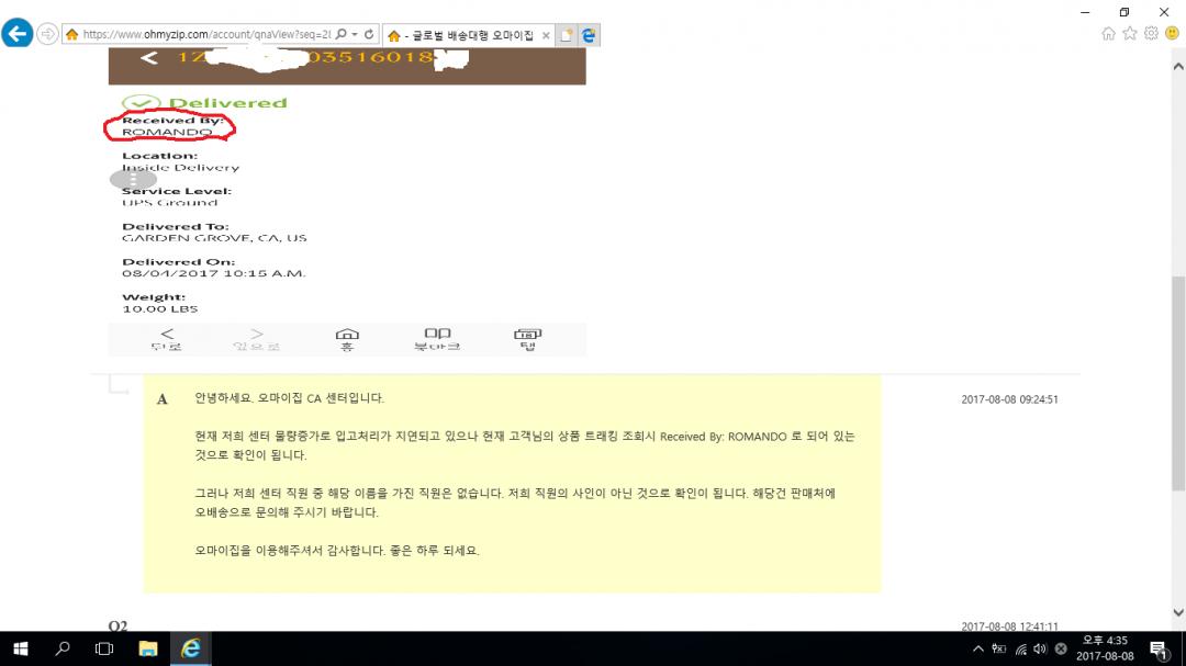 8월 4일 배송되었다고 ups떴는데 오마이집ca에서 입고처리가 않되서 문의하였더니