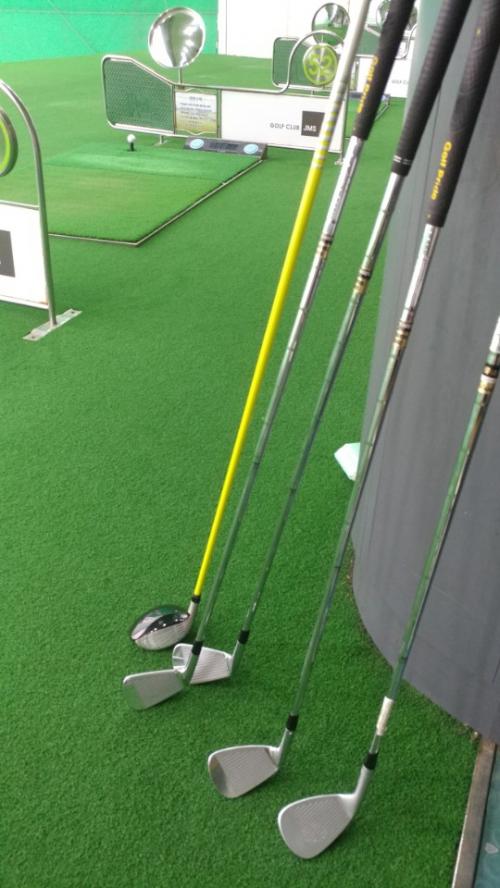 더운 날 연습중 늘어놓은 챕니다. 노란샤프트가 V steel 5번이고 미즈노 MP57 아이언 4,7,9번 그리고 보키 52도..