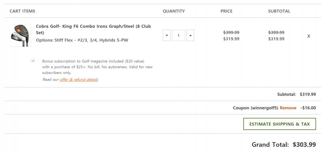 코브라 F6 6아이언 + 2유틸 세트를 399 달러에 팔고 있는데 이게 20퍼 할인에 5퍼 쿠폰코드까지 먹이면