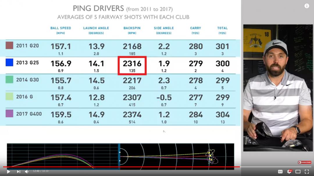 아래 표는 유튜브의 유명 골프 리뷰어인 Rick Shiels가 5년동안 핑 드라이버를 테스트 한 결과인데,
