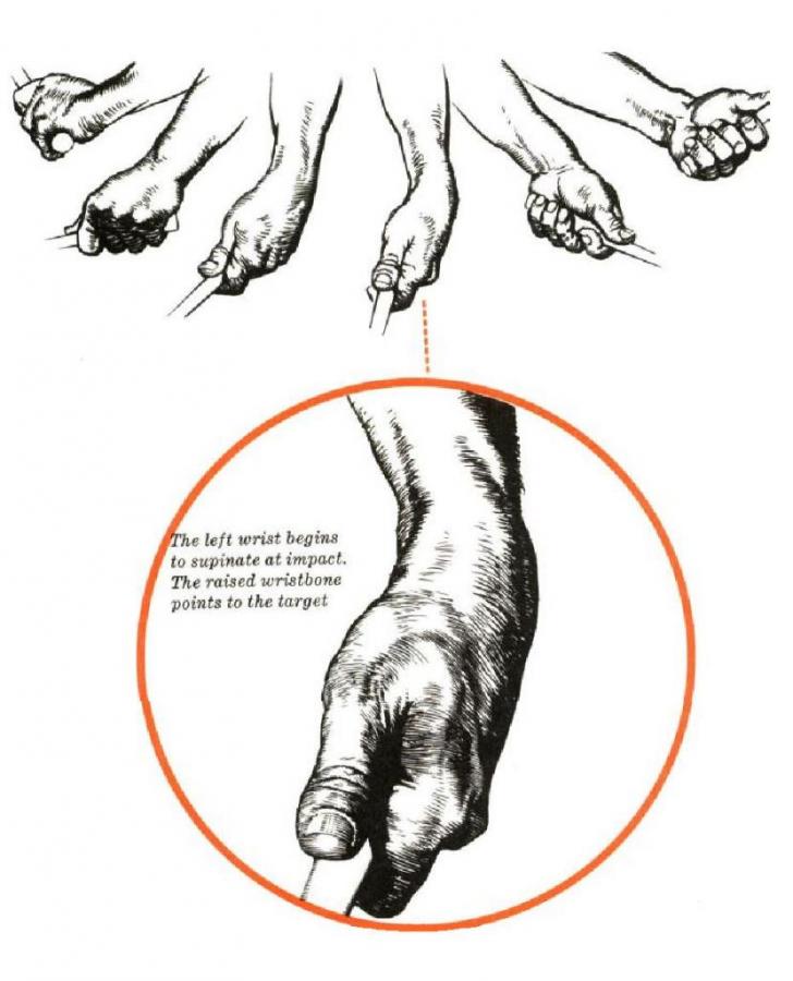 그런데 우리 프로도 의도적인 로테이션은 부정확한 타격의 원인이 되고 로테이션 후 왼팔꿈치를 자연스럽게 접어 주는게 중요하다고. 그림처럼 셋업시 손등위치대로 손등으로 치는 느낌을 가지라고 하네요. |