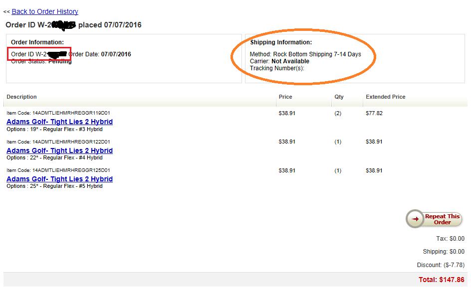 2. 트래킹 넘버는 배송이 시작되면 락바텀에서 "Order #1234567 from www.RockBottomGolf.com has been shipped." 라는 메일이 오고, ups 에서도 UPS Ship Notification, Tracking Number 1Z~~~ 라는 메일이 오는데, 1z 이하의 번호를 넣으시면 됩니다.