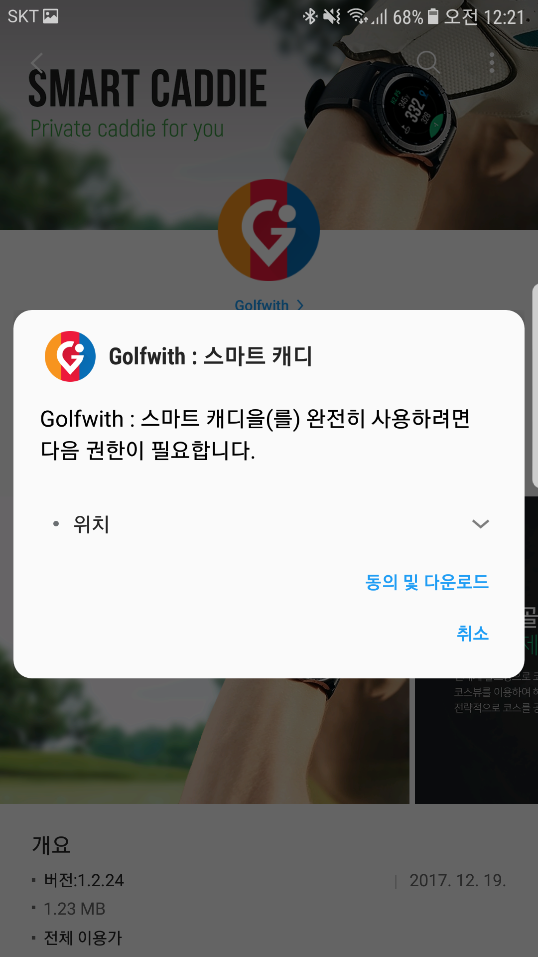 삼성앱 전용설치 마켓인 galaxy apps에서 스마트캐디를 검색합니다.