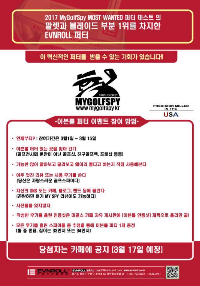 그리고 전에 소개해 드렸던 이븐롤 퍼터가 (주)케이제이골프 통해서 국내 판매시작했답니다. 아시다시피 마이골프스파이 2017년 퍼터 랭킹 1위를 블레이드와 말렛 부분에서 차지해서 여기 골포에도 잠시 인기 끌었었죠^^ 고맙게도 회사에서  1등 퍼터를 각 모델로 총 2개를 스폰으로 주셨어요. 해서 첨부한 사진처럼 이븐롤 추첨 이벤트도 있답니다.